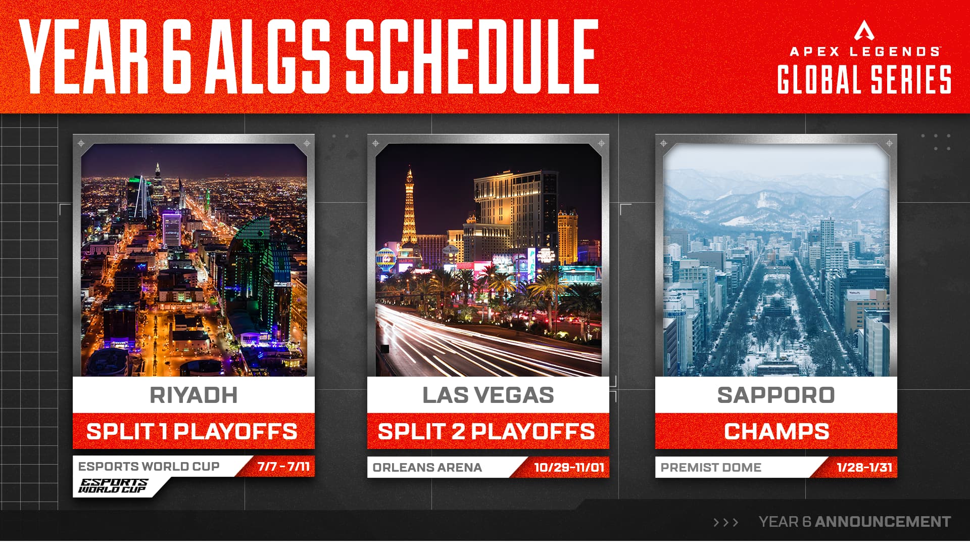 Предстоящий шестой год Apex Legends Global Series (ALGS) будет включать три крупных турнира. Первый, Split 1, пройдет в Эр-Рияде, Саудовская Аравия, в рамках Esports World Cup в июле. Split 2 будет проведен в Лас-Вегасе в октябре. А ALGS Championship снова пройдет в Саппоро, Япония, в январе 2027 года, что станет третьим годом подряд.
