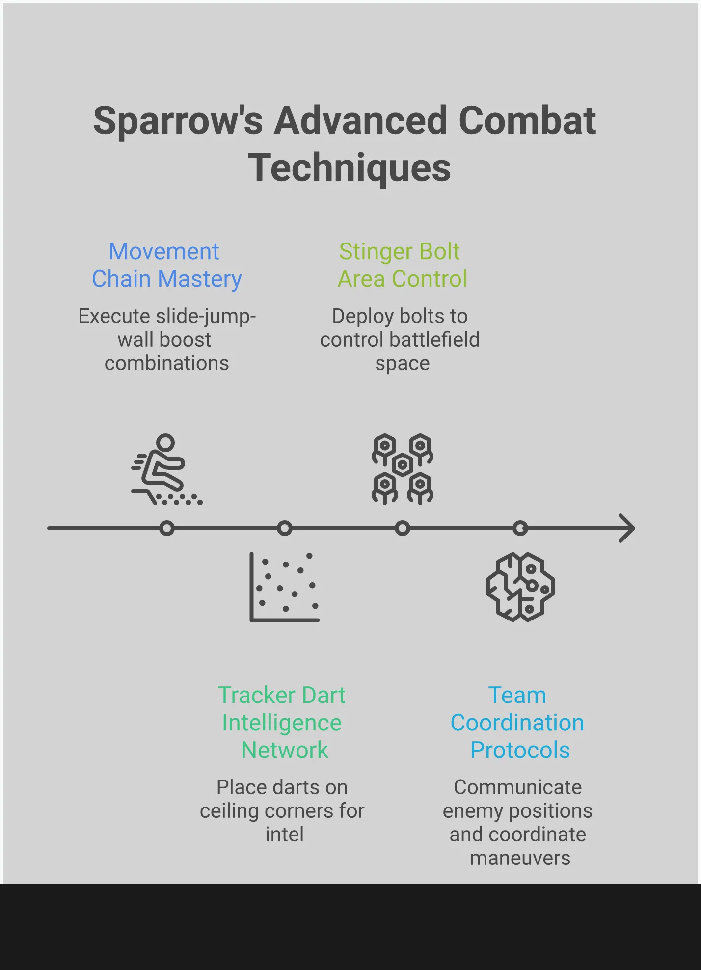 Sparrow перемещается иначе, чем многие другие персонажи. В то время как некоторые, такие как Octane, сосредоточены на быстрой наземной скорости, Sparrow преуспевает в контролируемом вертикальном движении. Он может быстро достигать высоких областей и вносить небольшие, точные коррективы благодаря своему двойному прыжку и способности отталкиваться от стен. Он не преодолевает большие расстояния так быстро, как персонажи вроде Pathfinder, но его очень трудно подстрелить в ближнем бою, потому что он может менять направление в воздухе и взбираться на структуры.