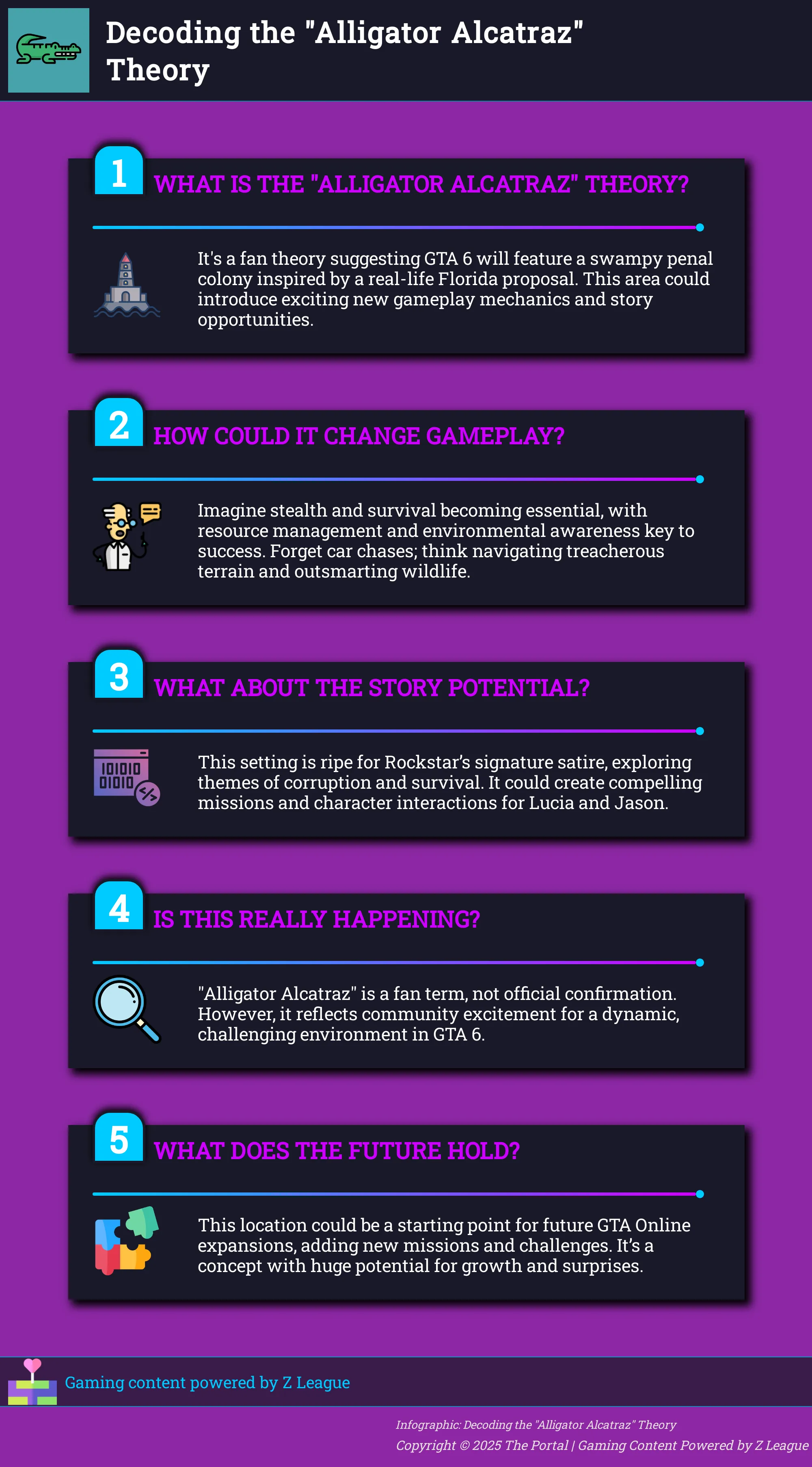 В уникальной интерпретации серии Grand Theft Auto, где города всегда были нашей ареной для хаоса, интригующая фанатская теория под названием ‘Alligator Alcatraz‘ предполагает, что GTA 6 может представить игрокам сложную окружающую среду вместо традиционных угроз в виде полиции или конкурирующих банд. Эта теория предлагает обширную болотистую местность, полную аллигаторов, которая могла бы стать естественной пенитенциарной колонией. Вместо грубой силы игрокам понадобится освоить стелс, управление ресурсами и наблюдательность за окружающей средой для выживания. Переход от городских ландшафтов к дикой границе открывает новый тип игрового опыта, вводя свежие стили вызовов.