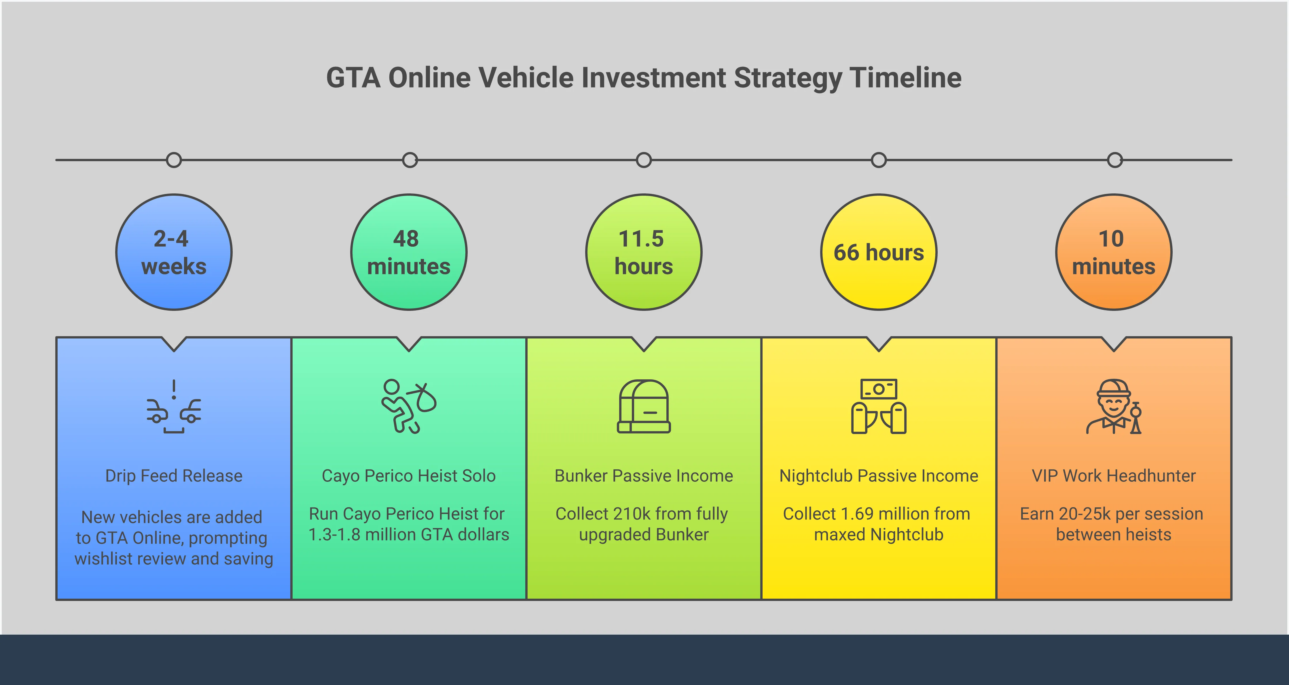 - Используйте график постепенного выпуска в своих интересах: Rockstar выпускает автомобили по одному в течение нескольких недель. Это дает вам ценное время, чтобы заработать деньги между выпусками, поэтому вам не нужно иметь миллионы с первого дня.