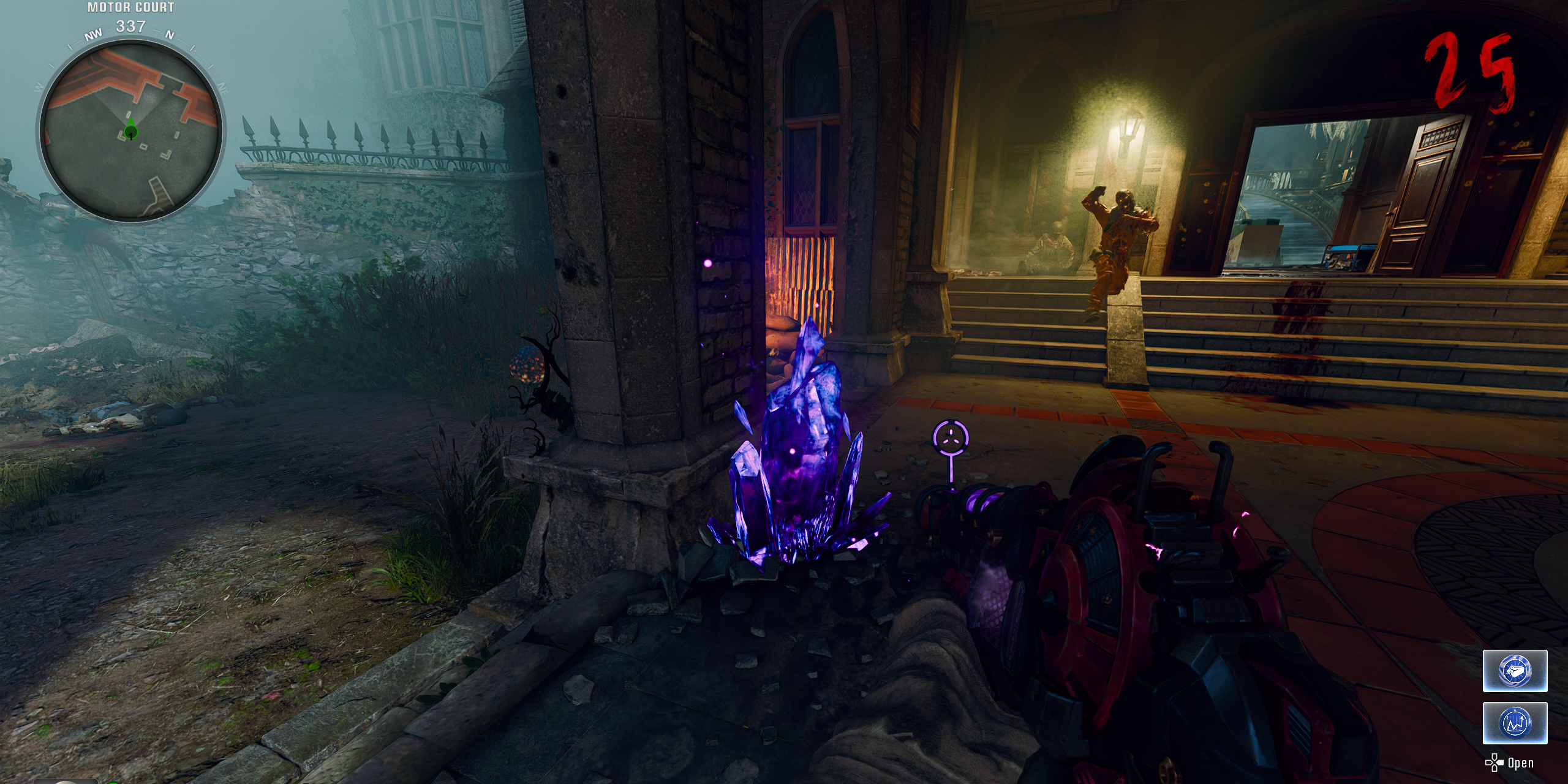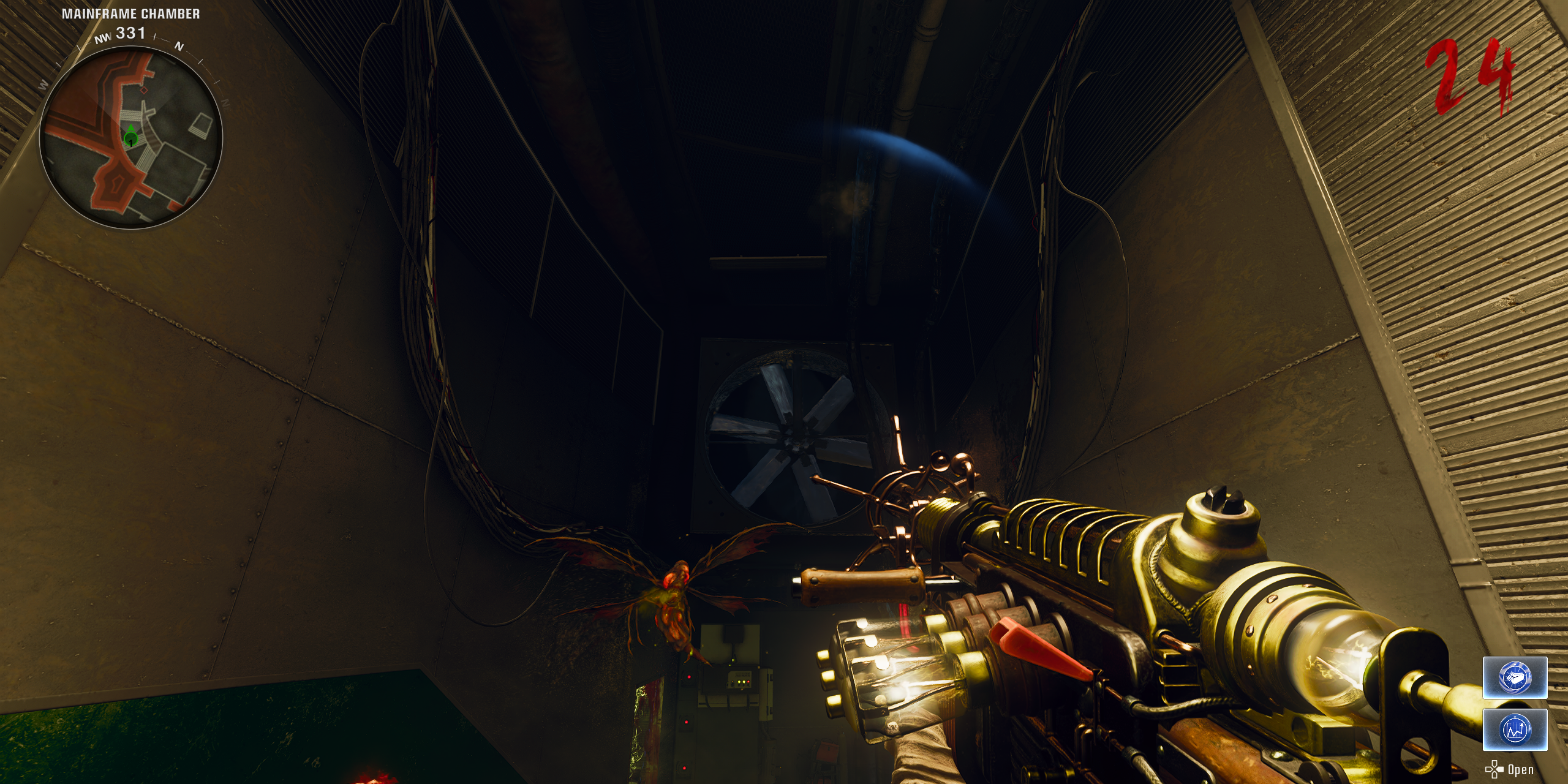 Как преданный игрок, после того как я завладел Wuunderwaaffe DG-2, я вернулся в Зал центральной памяти. Там, на лестнице ведущей к Pack-a-Punch, заметил необычную лужицу крови на полу. Взаимодействуя с кровью, я положил несколько насекомых и затем приготовился использовать Wunderwaffe DG-2. Направив гигантский металлический вентилятор прямо севернее от лужи крови, я прицелился и выстрелил мощным взрывом.