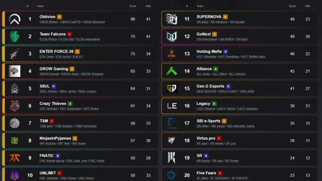 Oblivion, североамериканская команда, в настоящее время не имеющая спонсора организации, стабильно зарабатывала очки на протяжении девяти матчей, сыгранных в воскресенье. К Матчу 9 почти половина участвующих команд достигла матчевой точки, включая бывших чемпионов Falcons, которые чуть не выиграли прямой турнир после напряженной битвы 3v3 в Матче 8.