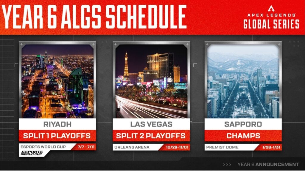 Шестой год Apex Legends Global Series поистине глобален, поскольку все три основных турнира будут проходить в разных частях света. Первый турнир совпадёт с Esports World Cup, за которым последует мероприятие в честь Хэллоуина в Лас-Вегасе. Финальный чемпионат состоится в 2027 году и вернётся в Саппоро, Япония – город, который стал постоянным хозяином серии.