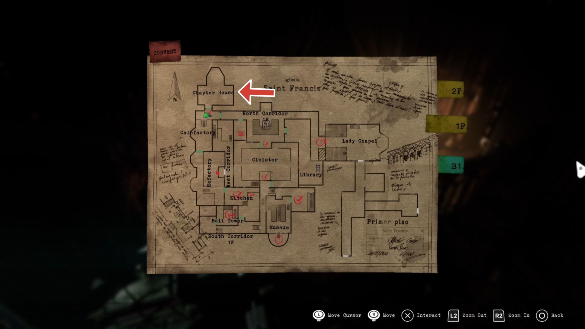 После входа в Chapter House, направляйтесь к задней части комнаты. Вы обнаружите группу стульев, на которых сидят люди, которые больше не живы. Опрыскиватель растений находится на стуле, расположенном наиболее к северу.